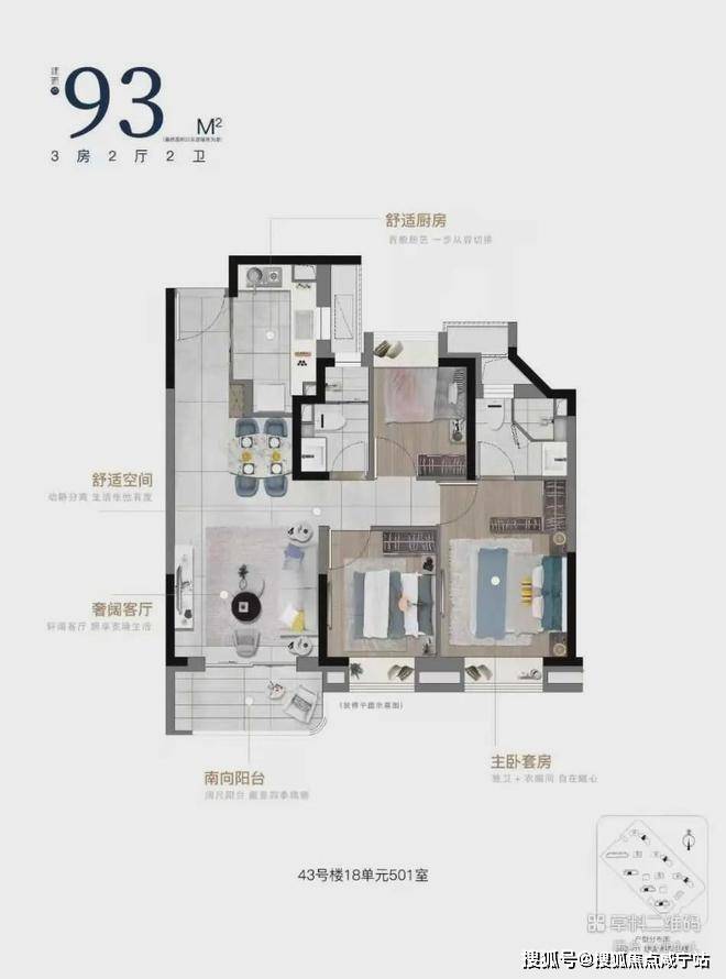 主力户型:89㎡三房两卫(得房率82%),创新"双明卫+U型厨房"设计