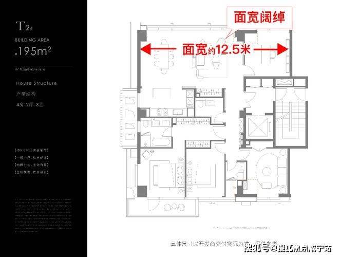 建面约195㎡北向面宽达到约12.5米,堪称IMAX观景面,和黄浦某顶豪275户型面宽数据相近。