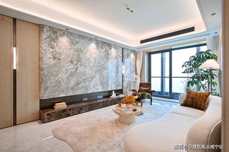 ✅中海·环宇玖章售楼处电话:400-8800-703✅︎✅︎✅空间立面大量运用影木木饰面,营造温润高级的居家氛围。电视背景墙采用一整面安第斯雪景天然大理石,次卫背景则选用雪山银狐岩板,墙面大面铺陈世纪冰玉材质,每一处细节都彰显匠心。
