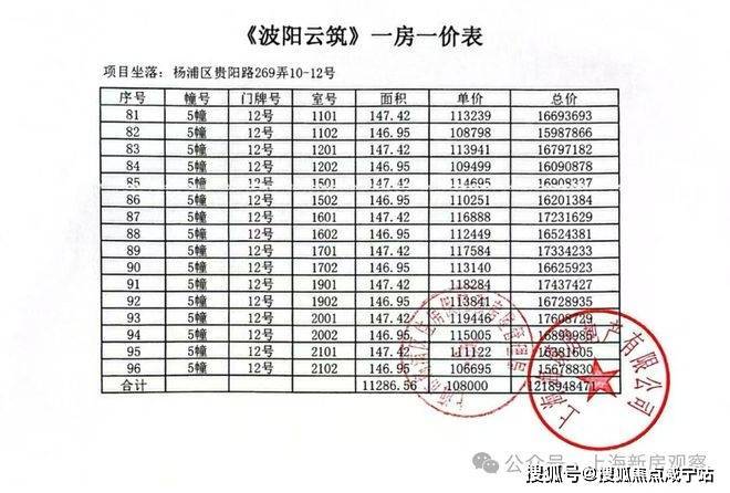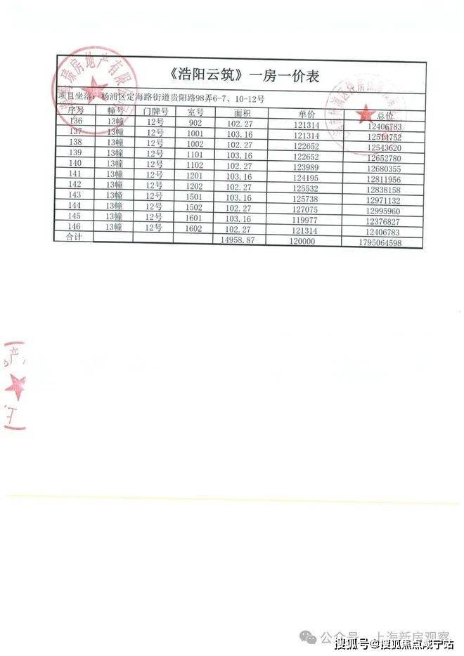 上期一房一价表如下: