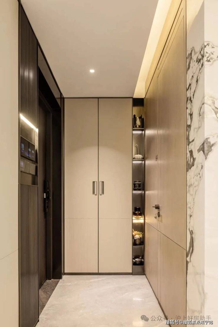 以主打的建面约100平米3房2厅2卫为例,进入样板间,首先映入眼帘的是设计感满满的入户玄关,轻卡门手感厚重,搭配飞利浦智能锁高端系列产品,品味与安全感相得益彰。门后的定制柜巧妙设置了玄关造景金属壁龛柜及女王高靴放置区,实用且大气美观,让归家的第一步就充满温馨与尊贵。