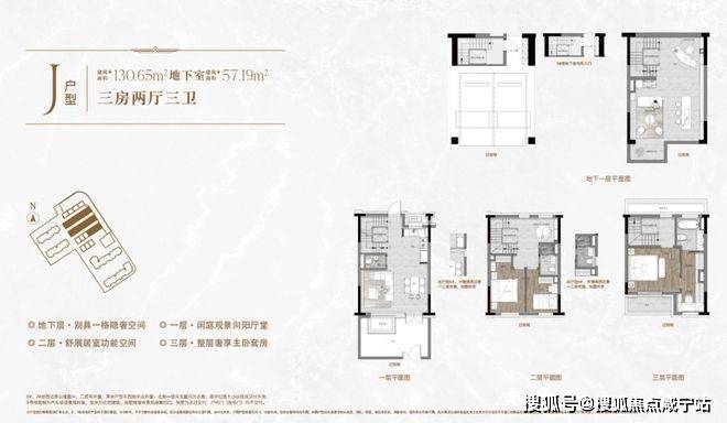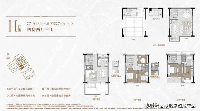 一楼和地下室主社交和志趣,二楼是子女的房间,三楼是主人休憩区。