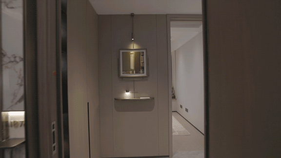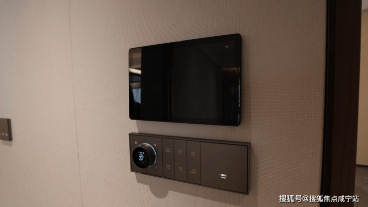 换好鞋,起身可以看到入户门旁配置了窄边框可视对讲,灰色高标肤感开关面板,三合一温控面板,未来可以通过它远程调节灯光,新风,中央空调,地暖,实现智能生活,到家就能享受舒适的居住状态。