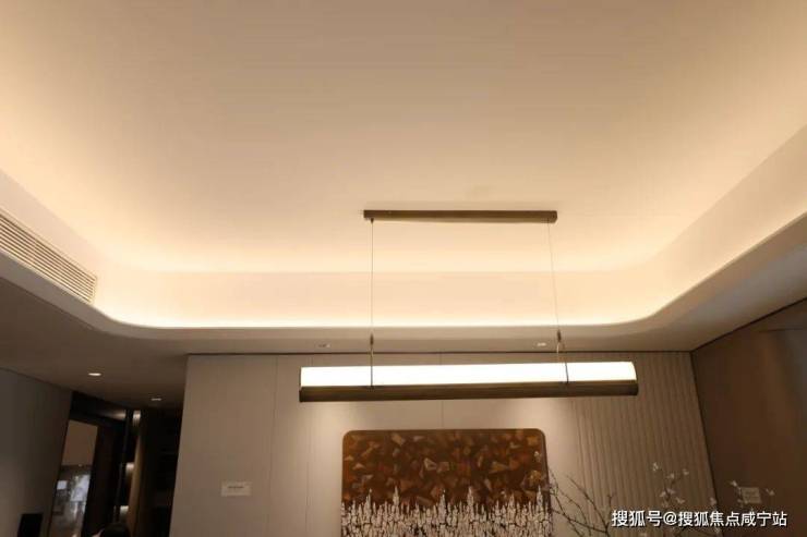 客餐厅地面同样采用了750*1500的大砖,电视背景墙采用浅色大面岩板。顶部采用弧形石膏板吊顶+四边反光灯槽(圆弧角)+吸顶灯+磁吸轨道灯,使客厅空间在视觉上显得更加宽敞。