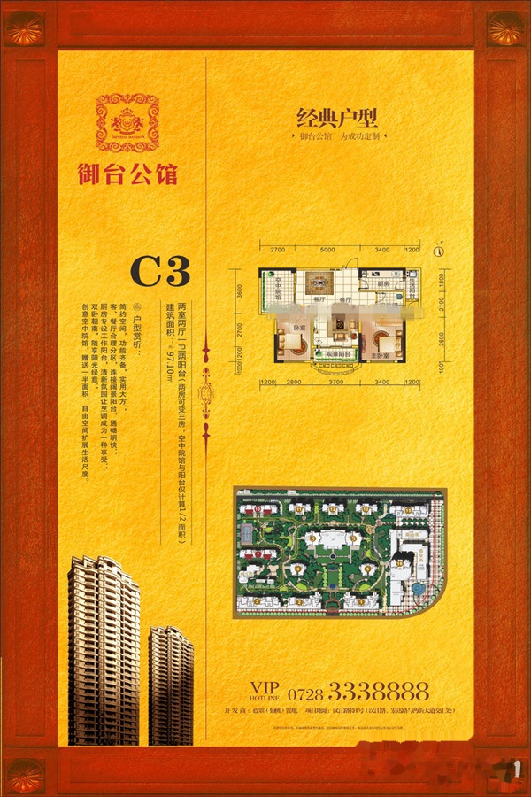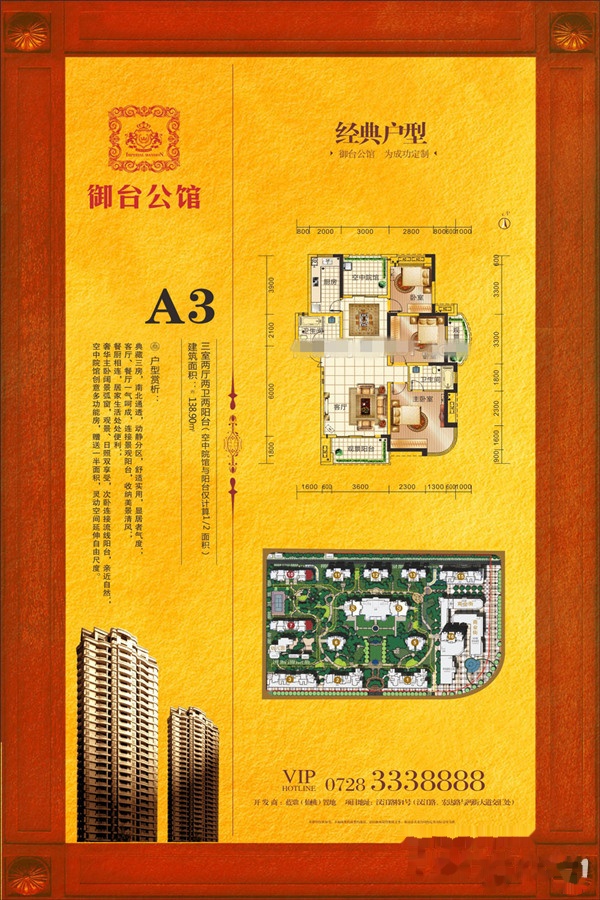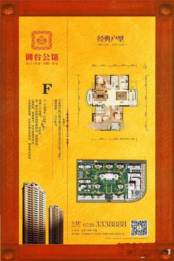 御台公馆开发商 新迈亚 心地产 2010年,迈亚成功竞得仙桃城区两个优势地块,开始进入地产业务的实质操作。由此,承接传统、放眼美好未来,“以纺织为基础业务、房地产项目多元发展”的新迈亚傲然屹立、奋然前行。凝聚全体迈亚人智慧、心力的迈亚“心”地产也由此启动,用心诠释“仙桃高品质地产领导者”这一发展定位。 御台公馆 释义: 御台公馆:御为帝王所作所为及所用物的敬称,台为高大伟岸的建筑,公馆指大官或富家的住所,现多指私邸,不仅是财富和奢华的代表,也是一种文化内涵,一种身份象征。 地理区位 仙桃作为“1+8”城市圈中距武汉近的一个城市,堪称湖北省“直辖市”,其经济发达、商贸活跃,拥有着通达全国的强大交通路网。随着城市公路交通运输的升级,仙桃的城市中、南部迅速发展,新的城市中心区开始崛起。 御台公馆,雄踞仙桃门户地带,东临汉江路、宏达路,北靠湖北移动公司仙桃分公司,西面是仙桃审计局新址,南面是规划中的玉沙大道,沪渝高速;位于仙桃未来的新金融行政圈核心,是仙桃新城市的标志性建筑,也是仙桃新生活的象征。 配套: 交通 项目周边交通便利,汉江路、宏达路、玉沙大道(规划)、沪渝高速交错相连,1路、7路公交直达项目。 公馆 公馆内部配备三层1715㎡会所,内有200豪华恒温泳池、SPA馆、健身房、咖啡厅、斯诺克馆等娱乐休闲设施;另有网球场、健身设备等配套;御台公馆规划商业总建筑面积12370.7㎡,其中包括商业服务网点和百货超市、影院等相关商业形态。 医疗 红十字会医院、江汉医院,一医附属门诊部为您和家人的健康护航。 教育 仙桃实验幼儿园、实验小学、仙桃小学、仙桃五中均纳入御台公馆的教育资源圈,加上小区内部规划的幼儿园,您的孩子将在这里得到茁壮的成长。 规划布局 御台公馆的建筑规划从“气”的角度按“8”字形布局,彷佛一个巨大的聚宝盆,让小区中财气绵长,轮转不息,流动的风吹旺业主的运势,也有利于保持身体健康和乐观心情。小区北面高层较多,且分布密集,而南面则以小高层为主,分布稀疏,平坦开阔。 中心会所部分的圆形广场形成小区中巨大的纳风筒,每当春夏季节,温暖湿润的夏季风便从南面开阔之地徐徐进入,为小区减去燥热,带来凉爽宜人的舒适感受。秋冬季节,干冷而风速较快的北风则被北面的外围建筑阻挡,不易进入社区,营造出学上难能可贵的“好气场”,把智慧的锋芒内敛于温文尔雅的建筑外表下,让建筑为人们实现生活的美好愿景。 景观园林 御台公馆的园林设计取法宫廷园林,严格遵循中轴对称,注重布局均衡与仪式感,以中央会所为核心,周边高层、小高层按照严格的几何形规整环绕,簇拥出宽敞明亮的中心广场,欧洲皇室的雍容华贵一展无余。 景观设计采用点、线、面相结合的方法,于小区中部设置下沉式景观庭院,与组团的庭院园景相互渗透,结合入户花园、屋顶花园,形成从“公共—一半公共—一私密”的空间过渡。乔木、灌木、草花姿态优美、层次丰富,走在小区内移步换景,步随景异,体现了皇家造园“万物皆备与我”的思想精髓。 建筑品质 建筑风格承袭新古典主义内在的古典秩序,造型以简洁明快为原则,通过阳台、露台、空调机位等构件形成清晰的构图关系和阴影关系,外墙饰面以土黄色面砖为主,商业和住宅首层辅以咖啡色花岗岩外挂石材,通过变形、简化、几何化处理,摈弃了过去负责的肌理和装饰,在保持外形的简洁的同时追求庄严与宏伟的气魄,使整个社区散发着充满力量而富有内涵的气度。 三层中心会所,地下一层,地上两层,位于地下的恒温泳池不仅在仙桃独此一家,更在武汉都见所未见,更配备网球场、下沉式庭院、水景广场、景观亭等,对于品质的先进追求,融合在每一寸土地之中。 户型设计 御台公馆在户型设计上力求个性、时尚和尊贵,布局合理、南北通透、动静分区、干湿分离,明厅、明卫、明厨、私密性强,留有足够个人活动空间,让忙碌一天的业主舒缓心情。住宅单元设计保证每户客厅和主卧朝向良好,视野开阔,避免视线干扰。所有厨房卫生间均对外开窗,保证其良好的卫生条件。 物业管理 特聘与万科同源的知名物管公司——之平管理,担任御台公馆的物业管理工作,首次引入英式管家服务的理念,为御台公馆的业主量身定做整套高品质国际化的物业管理服务方案,厘定完善的服务菜单供业主甄选。忠诚、谨慎、正直、机智……以优质的礼仪和细节为您扮演生活中各种角色。 安防系统 小区将实行全封闭管理,为了限度的保障业主的人身财产安全,我们将会设置六重全方位的防范系统。小区将配有小区监控中心、周界防范报警系统、闭路电视监控系统、电子巡更系统、可视对讲系统、家庭安全报警系统。