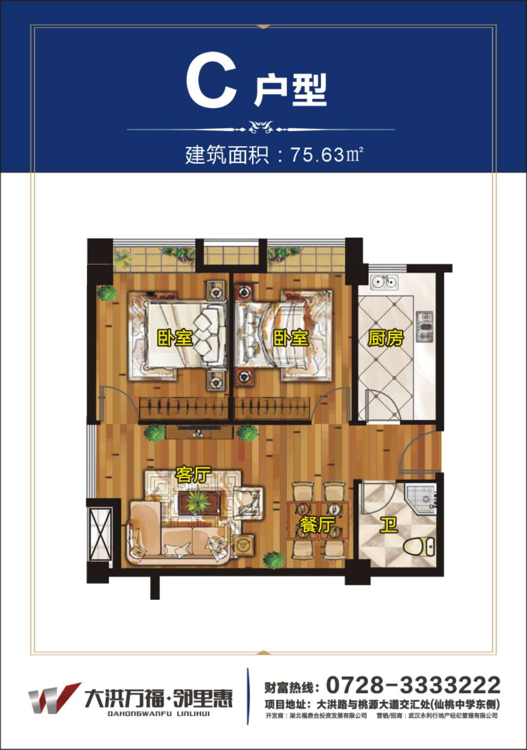 地段 大洪万福位于仙桃人文气息和商业氛围兼具的大洪路和仙源大道交汇处,是由湖北福鼎合投资发展有限公司精心打造的集商业和住宅于一体的城市综合体,是经市政府批准的老菜场改造工程,该项目紧邻仙桃沔中(即仙桃中学),三中、实验二小、金贝幼儿园等学府,周边密集的居住群体、师生及陪读家长,加之大洪菜场的历史地位,这使它拥有大洪这一区域独特的地段。 开发商 项目是由湖北福鼎合投资发展有限公司开发,集商业和公寓于一体的社区商业综合体,主要经营房地产开发、化工企业等业务。公司秉承“诚信、敬业、合作、创新”的企业精神,创造了良好的内、外部发展环境,管理制度日臻完善,培养了一支团结务实、敬业实干、开拓创新的管理团队。 项目介绍 项目总建筑面积约3万平方米,其中商业面积约2万平方米,住宅面积约1万平方米。项目共11层,负1楼为停车场和菜场; 西面部分1-4楼为商业,东面部分共10层,1-2楼为商业,3-10楼为公寓;北面部分1-2楼为商业;商业1-2楼层高6.1米,3-4楼层高4.5米,公寓层高3米。 本项目规划设计不同于仙桃其他商业综合体,我们是商业步行街的形式,商业有2条露天步行街宽度长度分别为9.3米,74.5米;8.4米,74.5米,另外西面部分商业有条宽5.3米,长74.5米的室内步行街,共计3条步行街,可以保证铺铺临街铺,客流畅通无阻。 另外本项目有一个小型广场,项目沿桃源大道退后15米,沿大洪路退后10米,形成一个小型广场,后期会在广场上做一些造型(如动漫人物造型、影视人物造型等),休闲座椅,花卉绿植等,吸引人气,为项目导流客户。 本项目是集吃喝玩乐购住为一体的城市综合体,商业部分面积30-200㎡之间,业态分布如下: 负一楼,生鲜菜场(建面约3000方),车库(建面约3000方); 一楼:书店、文具店、花店、咖啡、奶茶、饰品、服饰、小吃、快捷餐饮、日杂、诊所、批发等业态; 二、三楼:超市,快捷餐饮; 四楼:教培中心,美容美发,健身等 东面部分合计10层楼,1-2楼为商业(业态,烟酒、副食、足浴,餐饮等),3-10楼为公寓楼为稀缺学区房。项目公寓为四十年产权不限购不限贷,一层有19户共有4种户型,17套一室一厅,1套两室两厅,1套三室两厅,面积从60-100㎡之间。本项目公寓地处交通、生活便利,学府林立的大洪路,是名副其实的学区房。交通方面有四余路公交车途径本项目有8.12.15.16路,并且后期会在项目门口设置公交站牌,为您的出行带来便利; 周边的富迪三友等商业为您的生活带来便利,而我们自身的底层商业的入驻也完善了我们的生活及配套;项目毗邻仙桃中学、三中、实验二小、贝乐幼儿园等名校,这将会为本项目吸纳更多的消费群体,也将会为入住在这里的业主小孩上学带来便利,综上所述配套将大大提升本项目商铺及公寓的价值,投资本项目将是您明智的选择