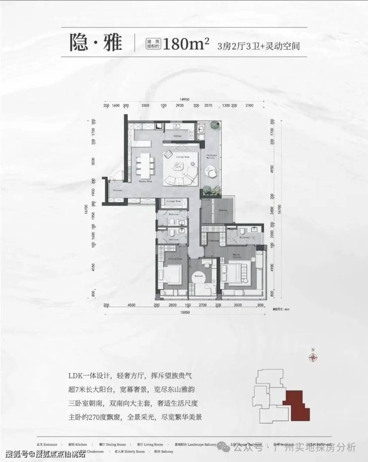 180㎡四房两厅三卫:东南向设计,配备双主套,主卧享有270°景观视野,低楼层可俯瞰社区园林,高楼层能远眺白云山。