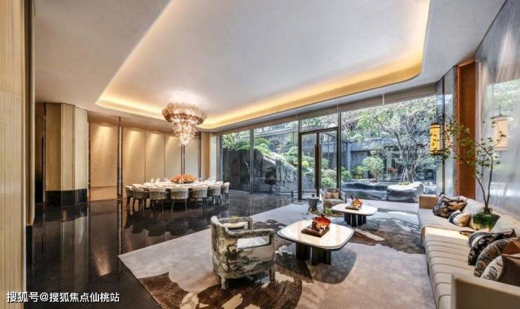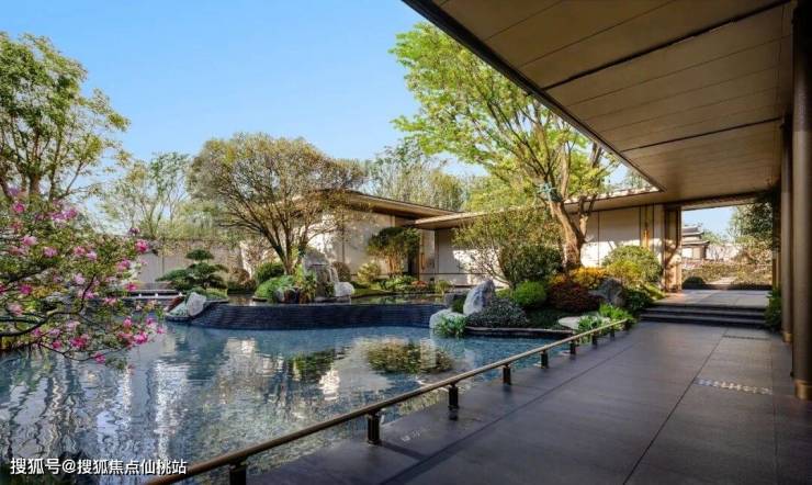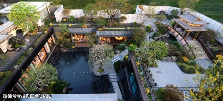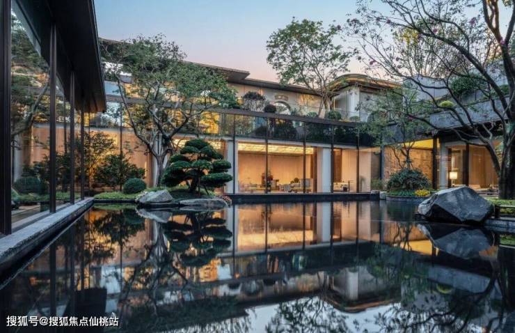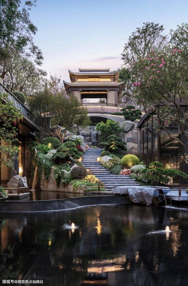 他们其实是把楼阁架在桥上,把桥架在瀑布上,让瀑布流淌在石阶步道旁,让步道一直贯穿到下沉式庭院的「一江春水」中。看到这样的场景,或许你会想起朱熹的「昨夜江边春水生,艨艟巨舰一毛轻。」朱熹的意思是说:选对了房子,你就会顺风顺水。