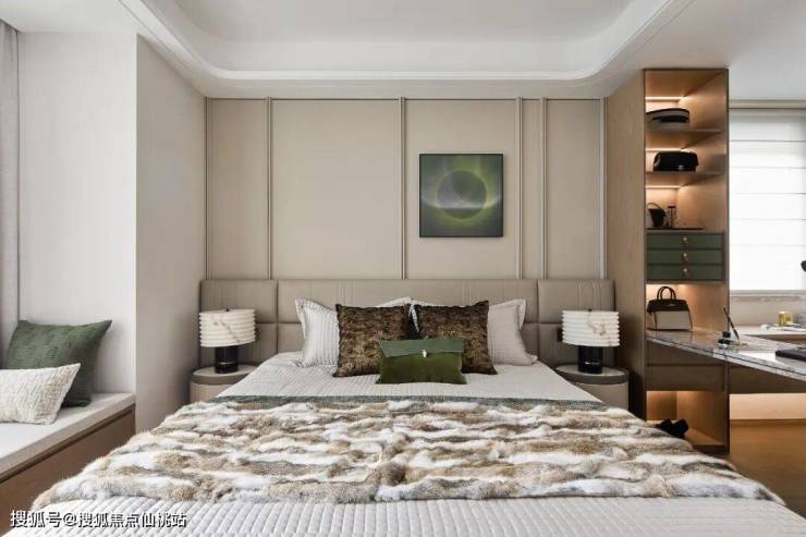 米灰软包墙围裹着松弛的气息,床头的绿调画作似揉进了森林的晨雾,与抱枕的墨绿缱绻相拥。仿佛时间在此停驻,只留与自己相处的松弛与美好。