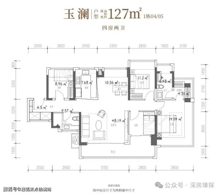 127㎡的4房2厅2卫,设计的是竖厅南北通透格局,进门独立玄关,客厅5.1米开间,客餐厅分离化设计,主卧270°无柱转角飘窗+衣帽间,分别做到了主卧18.55㎡/次卧11.2㎡/次卧8.96㎡/次卧7.84㎡(包含墙体飘窗),U型厨房烟道外置,卫生间干湿分离,得房率约98.97%(包含赠送),客厅连接次卧出超大阳台约14.09平,西南或东南朝向。