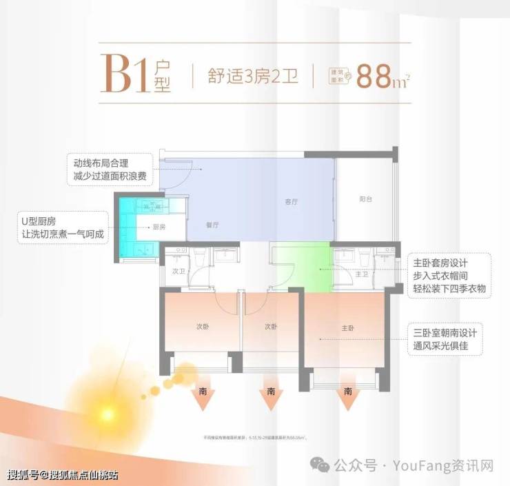 (1)三卧室朝南,全带大凸窗!(2)舒适主卧带衣帽间,一步到位!(3)U型大厨房,大客/餐厅,大阳台!(4)双卫浴,生活从容不迫!