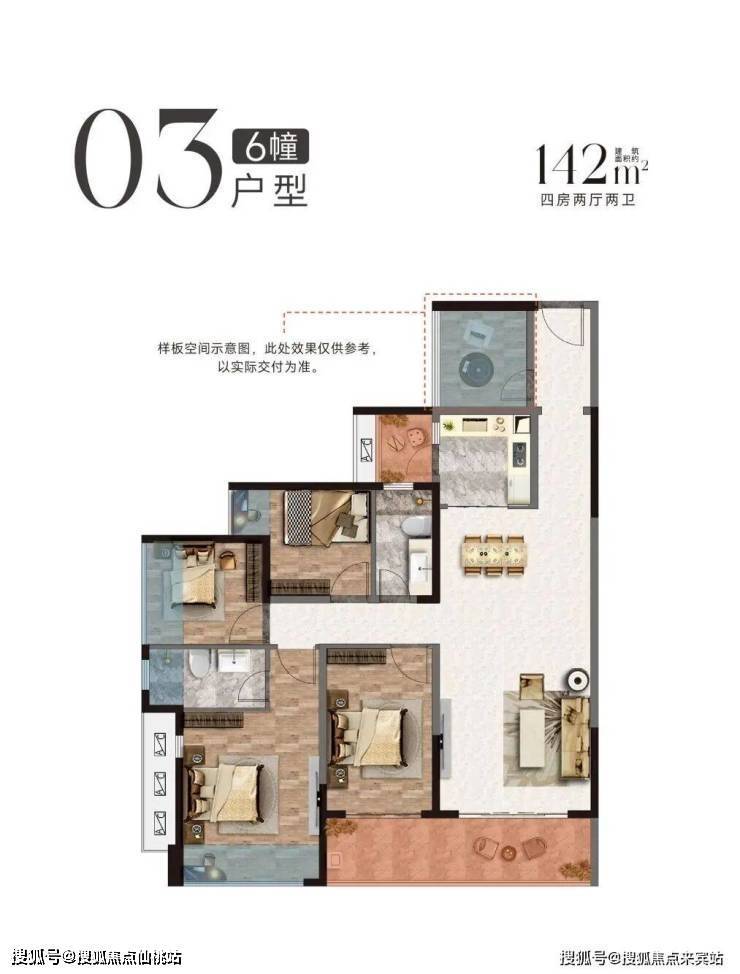 6栋以「每寸空间皆可兑现」的设计哲学,成就中山首个得房率至高达129%的爆款产品,成功超越区域同面积段传统四房小格局。