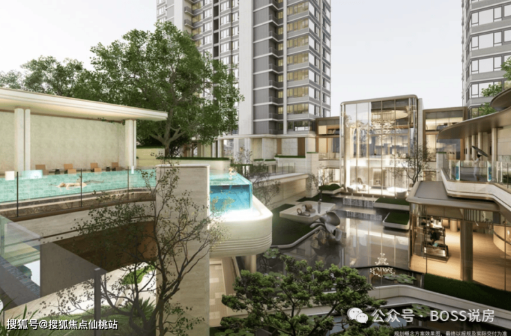 酒店式会所:引入板块首个酒店式会所,采用大面积玻璃幕墙设计。会所内规划有品质会客区、健身休闲区、雅致休憩区、游泳池等功能空间,为业主提供专属的高端休闲场所。