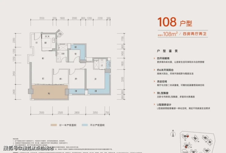 108㎡四房两厅两卫:客厅连接景观阳台,采光通风极佳;独立餐厅紧邻厨房,方便日常生活。各卧室空间方正,得房率约106%,东南朝向,尽享温暖阳光与清新空气。无论是家庭聚会还是孩子嬉戏,都能在这里找到属于你们的幸福时光。