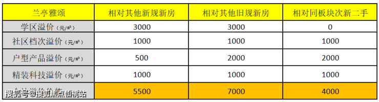 把以上学区、社区、产品、精装和科技实际价值抽出来,兰亭雅颂对比其他项目的真实溢价应该是这样的: