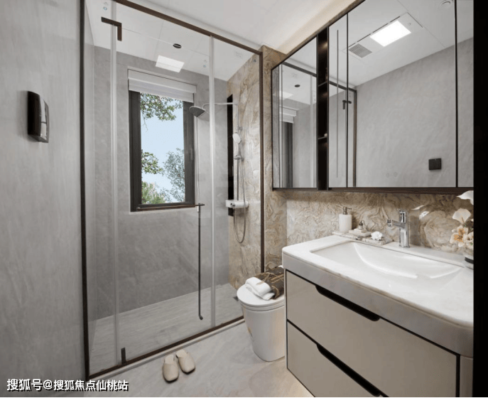 卫浴间全采用科勒智能马桶+大面石材岩板墙面+大理石台面+大理石拉槽地面+恒温龙头+头顶、手持双花洒,对标高奢酒店标准。
