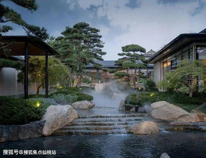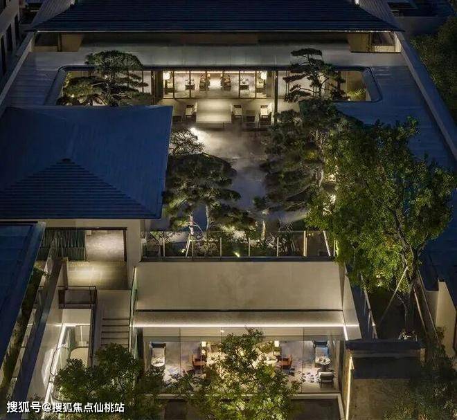 三进院落布局,融合泰山玄武黑石材、太行蓝翡翠等天然材料,活水园林与造型松构成“一步一画”的沉浸体验。