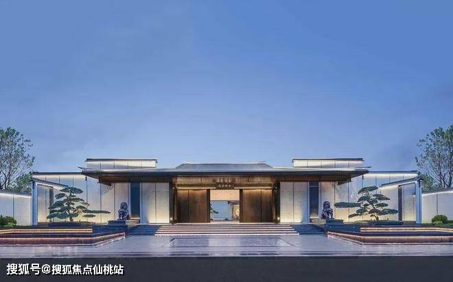 威赫的新中式主入口,高约8米,宽约44米,极具震撼力。大门沿袭了中式屋顶的规制,三段式,四开间,整个门头呈现对称之美。