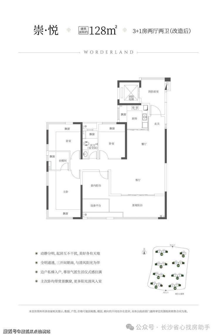 建筑面积约128㎡3+1房、约5.9m客厅开间、得房率约113%(含电梯厅)