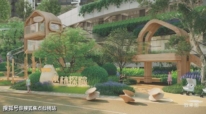 设置瞭望塔、树屋、攀岩墙等分龄段游戏区,高绿量的户外亲子互动场地。