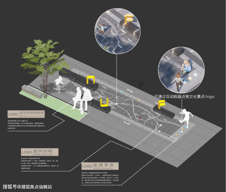 热带植被环绕的林下空间里,是一幅嵌刻在地面的《千年古城-科技新城时间轴版图》,它以时间轴地图的形式描绘了崖州古城到新城的发展历史——公元 1044 年的崖城学宫为起始,到崖城古城、黄道婆黎族棉织地水南村,直至现如今的汀澜和著所处的崖州科技城。立于版图的一侧的是对于这段历史中人物、建筑、文化的简介。
