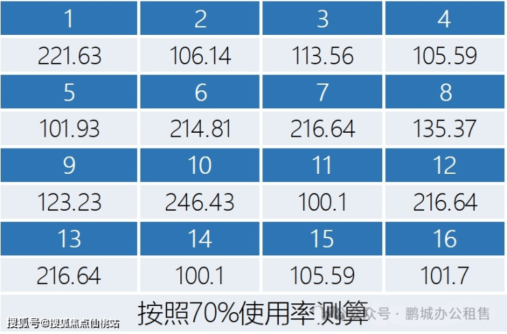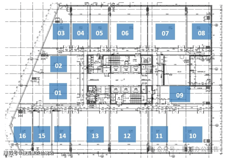 标准层的建筑面积约为2426平方米,总计包含16个办公单位,每个单位的产权面积介于100至246平方米之间。