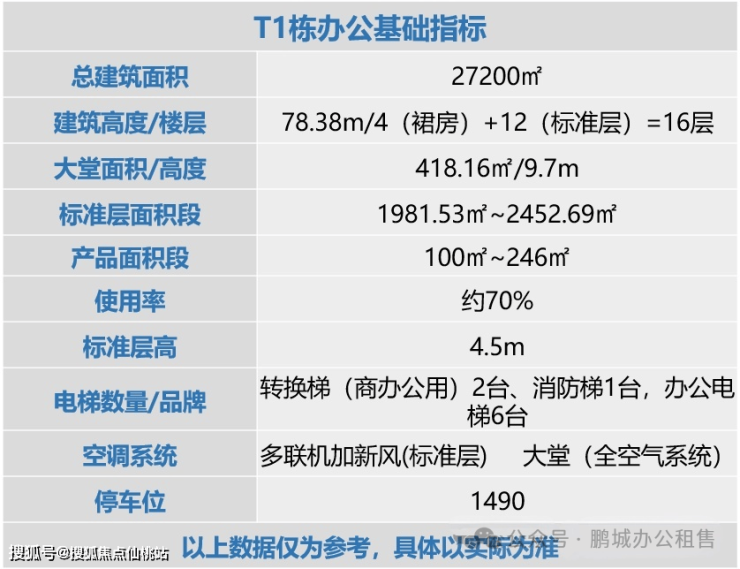 T1栋办公区域的建筑面积约为27200平方米,建筑高度约78米,符合100米的限高要求。该建筑的第5层至第16层