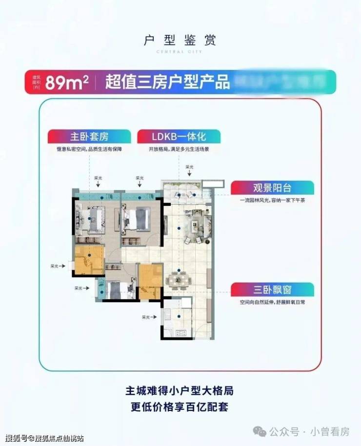 合生中央城提供的户型设计注重实用性和舒适性。项目主推建面约85-197平方米的三至四房洋房和空中复式云墅,满足不同家庭的需求。其中,85平方米的三房户型紧凑实用,适合刚需家庭;而110平方米和123平方米的户型则更为宽敞舒适,适合改善型家庭。所有户型均经过精心设计,确保每一户都能享有充足的采光和优美的景观视野,提升了居住的舒适度和幸福感。