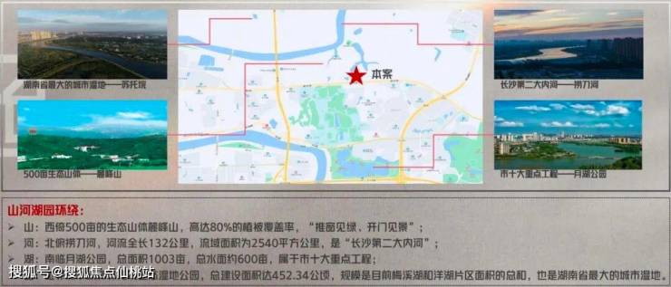 项目南临约1003亩月湖公园,西靠500亩生态山体麓峰山,北靠捞刀河风光带和苏托垸生态湿地,坐拥IMAX山景,远眺千米滨水河岸风光,超级绿肺举步即享,繁华都市里的静谧“桃花源”。