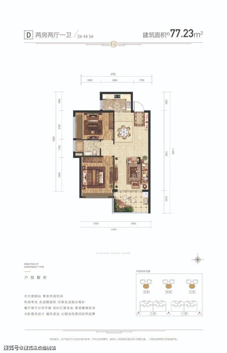 D户型面积:建筑约77㎡ 2房2厅1卫