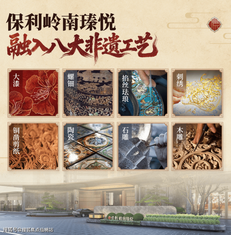 精美传经典,营造人文意境:建筑立面融合现代岭南元素。园林匠心打造“两环两轴五园三组团”的立体景观,并融入“八大非遗工艺”营造美学场景。