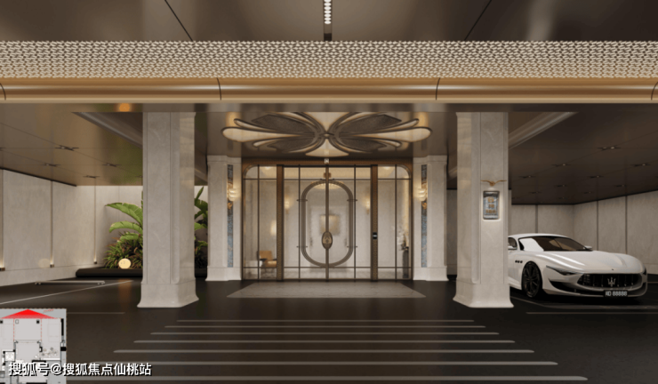 社区入口设计融合海洋元素的流体美学与几何美学,采用八根花柱造型;柱跨间为南洋风格艺术拼花彩玻,搭配奢石装饰门套、VI纹饰把手等细节,形成“八柱六门”入口空间;入口大门尺寸为12米高、90米宽。