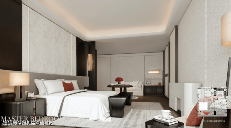 230户型采用静奢雅致的轻法式风格,天然木质与浅灰石材和谐搭配。设计强调整体协调,通过石材背景墙的厚重感、地面肌理与尼斯木的质感对比,构建出丰富的层次;弧形天花巧妙柔化硬质材料的直线感,最终营造出功能与美感并重、雅奢而富有秩序的空间氛围。