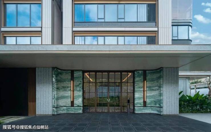 建筑美学:采用摩登海派建筑风格,外立面以蓝灰色Low-E玻璃与浅灰色仿石铝板组合,搭配香槟金金属线条,实现270°转角无柱曲面屏设计,营造开阔观景视野。
