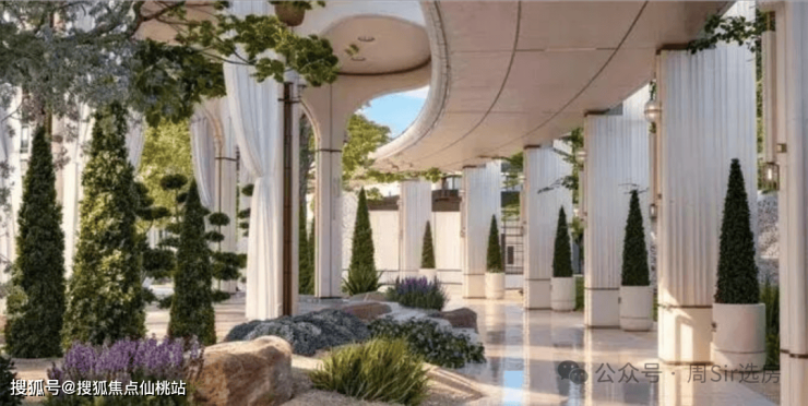 约75米风雨连廊,让业主回家不必淋雨或暴晒,两侧搭配错落有致的南法树种。每一棵树、每一个摆放位置,都经过反复推敲——不惜成本与心血。廊下是无边界社交场,廊外是南法花园。