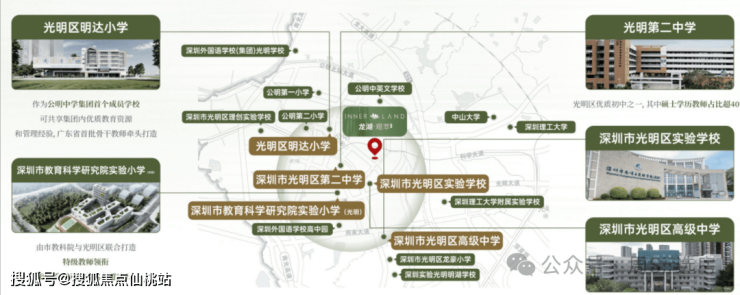 地块2km范围内集合了红山体育中心、光明区少年儿童图书馆、公明广场、红花山公园、楼村湿地公园、公明中学、公明中英文学校、光明高级中学、光明区第二中学、深圳理工大学明珠校区、大仟里购物中心、光明人民医院西院区等成熟生活及市政配套,教育资源尤为丰富。