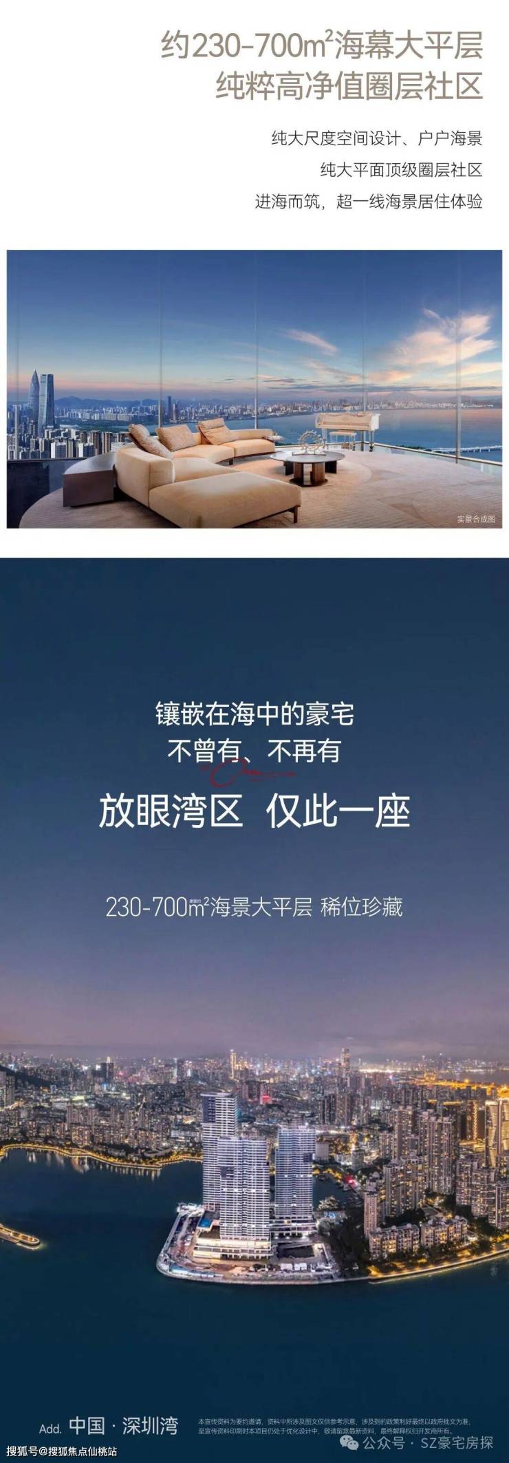 内部配套:配备高端私密会所、约 766 平方米的深圳首个悬空无边际海景泳池、首层城市花园、健身房、儿童游乐区以及 1800 平方米的海洋博物馆等设施。