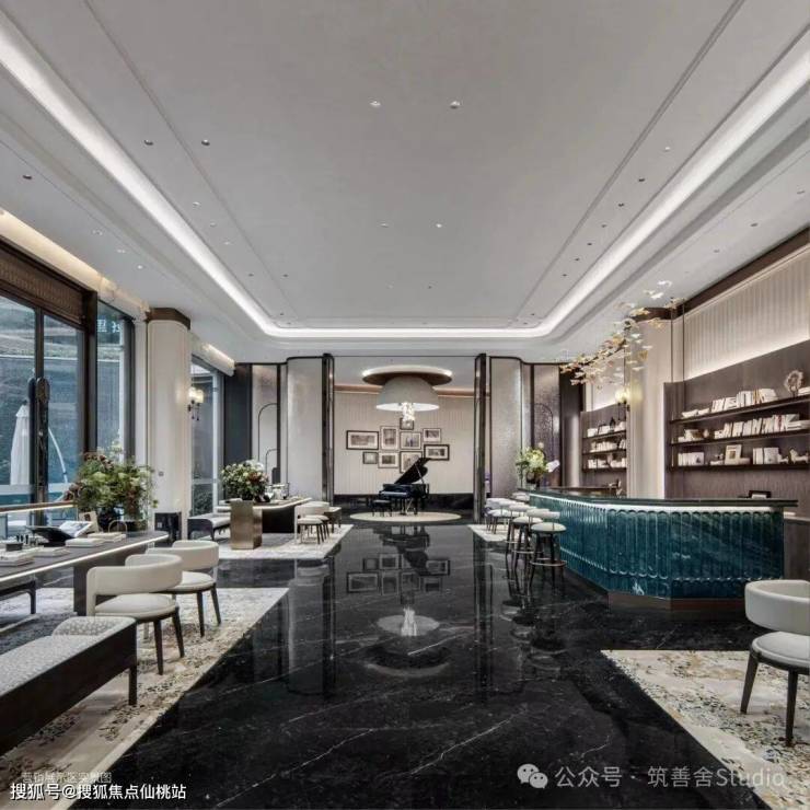 下沉式会所,地面铺设与售楼处一致的珍贵石材,以不变的品质,奠定艺术与生活交融的基石。随着琴键的轻敲,跳跃的音符与地面细腻的纹理共鸣,宛如黑白琴键间流淌的旋律,交织出生活的和谐乐章。