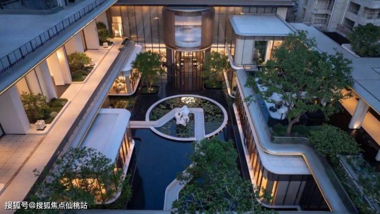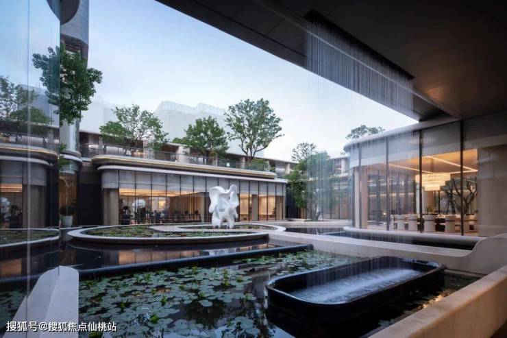 在园林打造上,项目复刻了曼谷四季酒店的度假美学,打造出由水院岛屿组成的下沉庭院。水系以舒展的姿态漫入公共场域,模糊了建筑与自然的边界。社区内分布着米勒花园、四季岛屿等五大主题花园,每个花园都有独特的植物配置与景观小品。