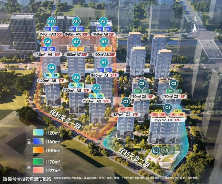 保利天奕位于广州市海珠区琶洲南区扬展街 8 号,是保利发展旗下的天字系高端住宅项目。项目总占地约 6.7 万㎡,总建筑面积约 13.8 万㎡,容积率 2.5,绿化率 35%,规划 20 栋 16-32 层住宅,约 950 户,车位配比 1:1.6。在产品设计上,保利天奕主打建面约 127-170㎡全四房户型,采用全南向板楼设计,2T2 户配置,南北通透,使用率高达约 120%,精装交付。