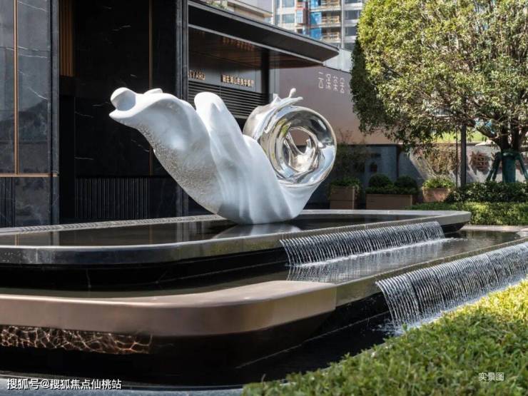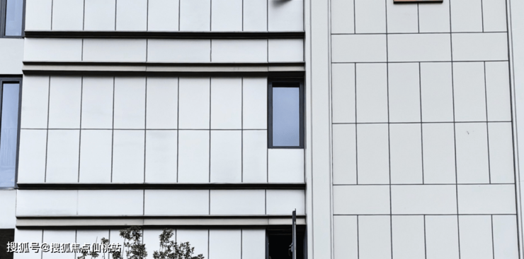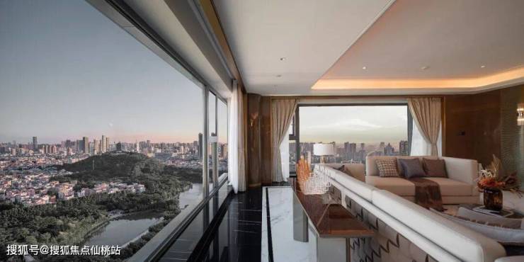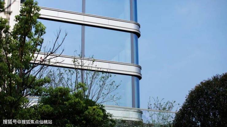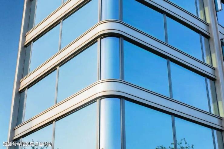 采用大面宽玻璃幕墙搭配金属铝板线条,南地块客厅转角创新采用造价更高的弧形玻璃,以更高成本、更精密工艺,保证立面的美观性,勾勒轻盈、透亮的无界天幕。
