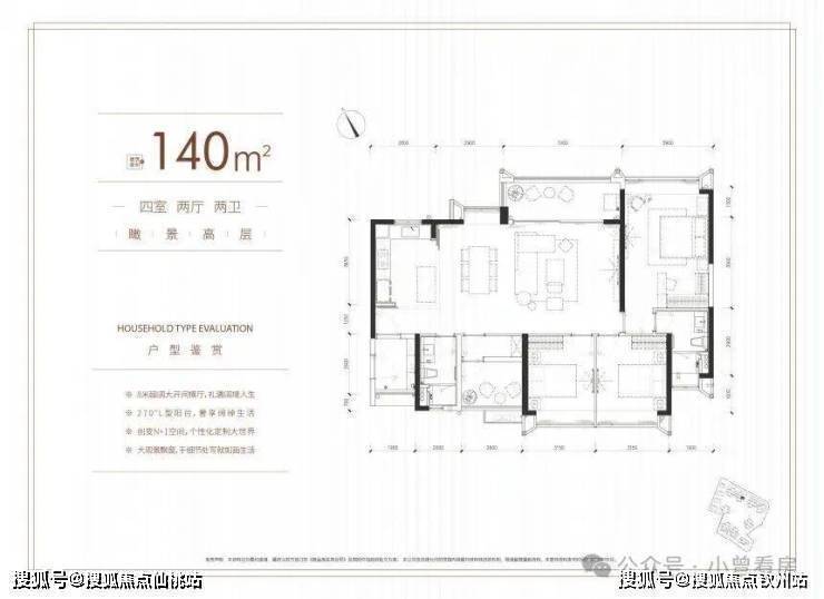 另外还有140㎡的四房户型,采用横厅设计,南北对流,北向主阳台望公园,南向卧室飘窗看小区园林,只是目前剩余房源已经不多,价格也相对更高一些。
