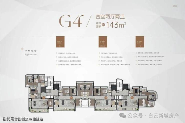 项目的总规划为349户,并包含多个不同类型的住宅产品,以满足不同购房者的需求。除了4栋(R1-R4)政府配建房外,项目对外销售的产品主要包括叠墅、小高层和高层,每户户型建面均为143㎡。这使得该项目满足了不同家庭结构的需求,尤其适合追求大空间和高品质生活的高端家庭。