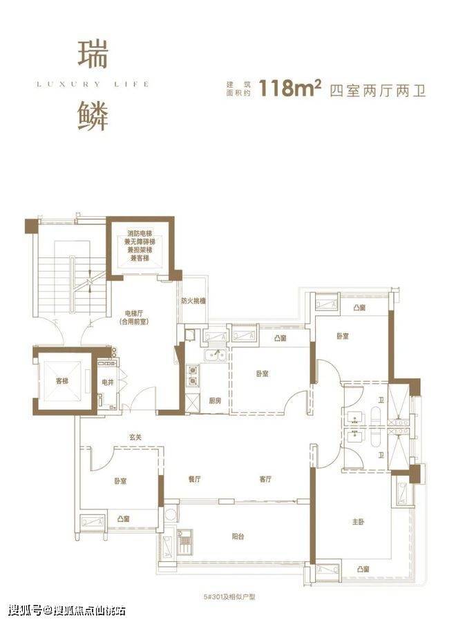 建面约118㎡户型(5#301及相似户型),则以更为精巧的尺度,实现了四室两厅两卫的全能格局,堪称“友好轻奢”理念的浓缩典范。其核心在于打造了一个LDKB一体化家庭厅,让客厅、餐厅、厨房与阳台流畅贯通,形成高效互动、情感充盈的家庭核心区。