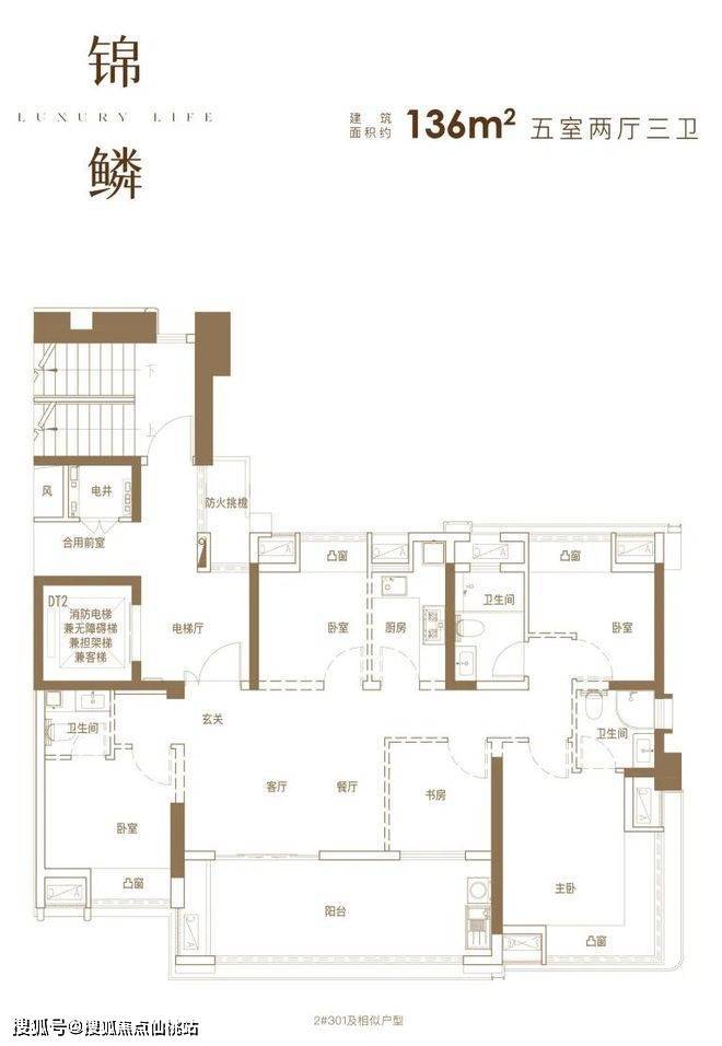 建面约136㎡户型(2#301及相似户型),罕见地打造了4.5开间+双套卧+三卫的格局。