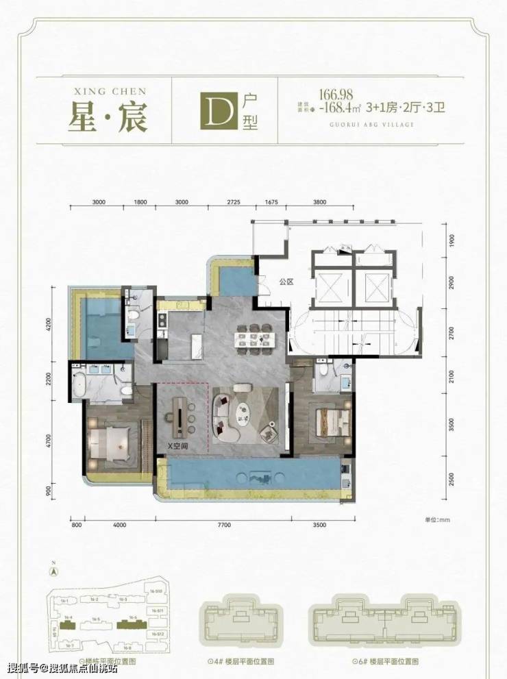 D户型: 建面约166.98-168.4㎡ 3+1房2厅3卫