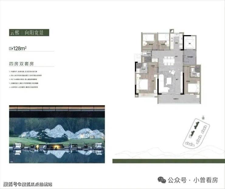 128㎡|四房三卫,专梯专户,私密归家,约4.2m开间多功能会客厅,空间尺度从容有序。约7.3m奢阔大阳台,揽山望园多重景观。