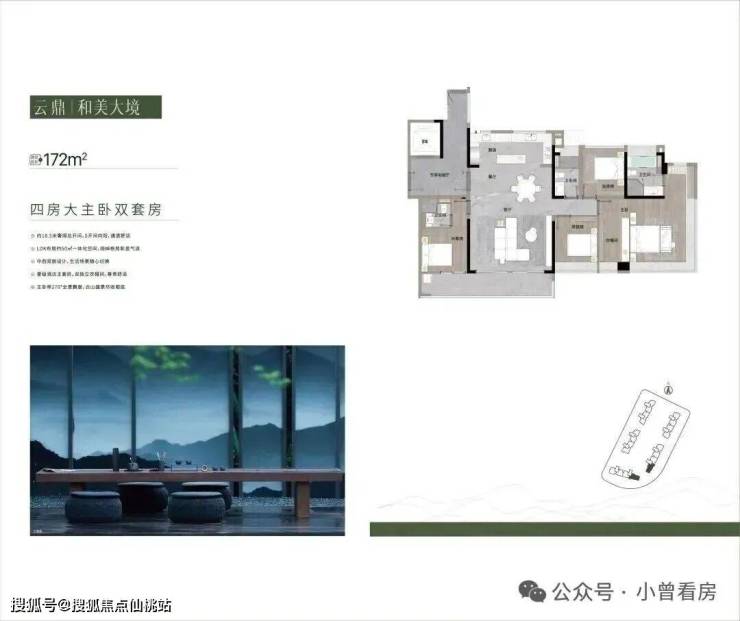 172㎡|四房大主卧双套,约18.5米奢阔总开间,5开间向阳,通透舒适,LDK布局约50㎡一体化空间,阔绰格局彰显气派,主卧带270°全景飘窗,云山盛景尽收眼底