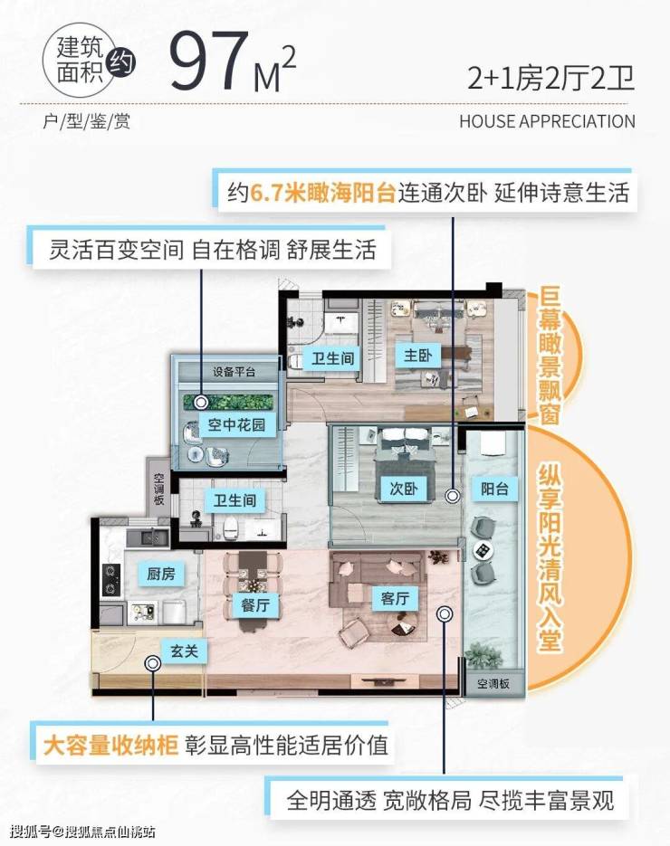 建面约97㎡2+1房,舒适度更上一层楼。