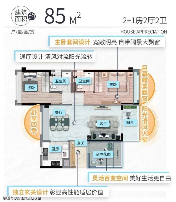 建面约85㎡2+1房,面积虽小,却无微不至的照顾到业主的生活需求,舒适度很高。